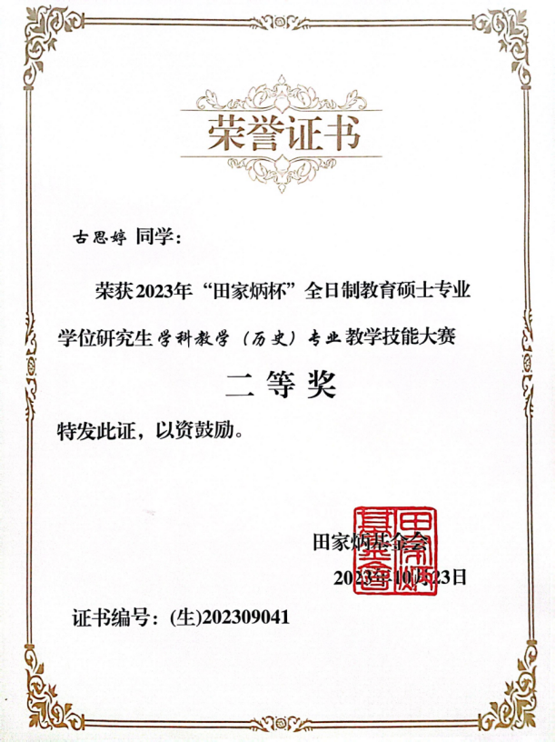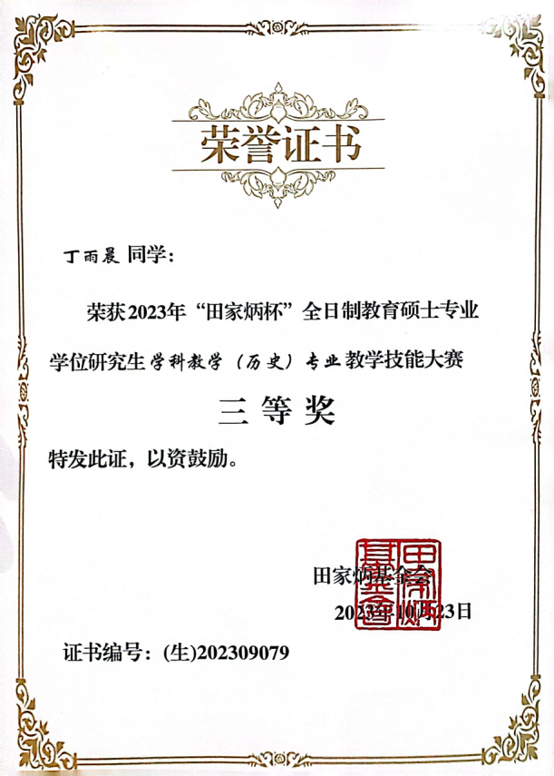 我院2022级学科教学(历史)专业硕士研究生古思婷、丁雨晨进入决赛,由王洁、张旭老师带队赴成都参赛。经过激烈角逐,古思婷同学夺得二等奖、丁雨晨同学夺得三等奖,张旭老师获得“优秀指导老师”奖。