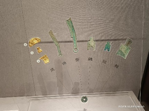 在文字的载体方面,经历了从龟甲到青铜再到竹简的转变。图2是商朝甲骨卜辞的一部分,见到这件文物时,我联想到了学习中国古代史时的相关知识:商代甲骨占卜的过程,可以分成整治甲骨、占卜、刻辞及存储四个阶段;而甲骨卜辞的行文有也一定的格式,包括前辞、命辞、占辞和验辞四个部分。图3是西周时期刻于青铜器上的铭文,即金文。相较与龟甲上的甲骨文,金文大多记述了祀典、赐命、诏书、征战、围猎、盟约等活动或事件的记录,反映了当时的社会生活。文字记载内容的转变也反映了人们的观念从崇天敬神逐渐转移到注重现实。图4是一组记录着2400多年前历史信息的珍贵竹简——新蔡葛陵楚简。这组楚简为战国时期文物,采用特殊的方式进行保护性展出,1994年出土于河南新蔡葛陵故城楚墓,共出土竹简1500余枚,文字数量达8000多个,墓主是楚国重要的封君平夜君成。参观完三种记载文字的载体,我直观地感受到了时空变换后生产力的不断进步。记录文字的载体在改变,记录文字目的在改变,记录文字的内容在改变,文字本身的形体也在改变。我再次感受到了中华民族伟大的创造力的传承力,也感受到了历史的温度与价值。