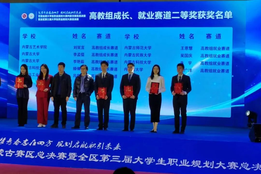 2023年12月10日,首届全国大学生职业规划大赛内蒙古赛区总决赛暨全区第三届大学生职业规划大赛在内蒙古农业大学落下帷幕。经过激烈角逐,我院2023级学科教学(历史)专业王恩慧同学荣获就业赛道高教组二等奖,指导教师檀晶、王建国获优秀指导教师奖。