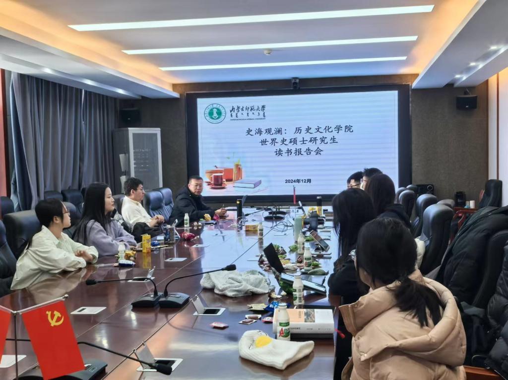 2024年12月27日下午,我院24级世界史研究生齐聚学院楼B502会议室,进行了“史海观澜”读书汇报会。同学们纷纷上台推荐了世界史书籍,并深入阐述书中精髓。整个读书会的气氛热烈而融洽。同学们共同分享阅读世界史书籍的感悟与思考,在知识的海洋中畅游,感受历史的波澜壮阔。