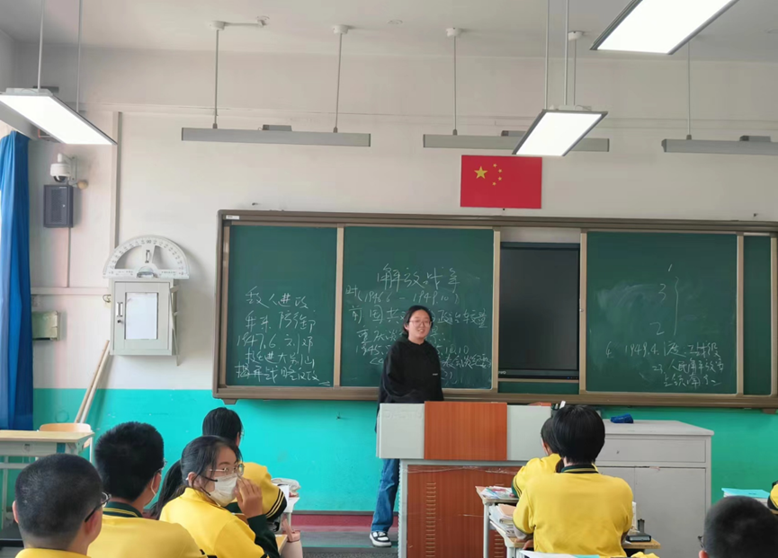 本次实习在首都师范大学育新学校房山分校的赵楷初同学,主要负责七年级的历史授课以及初一年级二班的班级管理工作。在历史授课方面,他认真备课讲课,参与日常授课及教研公开课,已负责讲授七年级历史课八个课时、八年级历史教研公开课两个课时,并在八年级历史教研公开课后接受房山区历史教研组长指导与建议,同时,该同学参加了北京房山区历史教研会议,学习如何引导学生对历史问题进行分析和理解,丰富和锻炼其学习能力,这使他更加深刻的理解到实践的重要性;在班级管理工作方面,他担任初一年级二班副班主任,负责监督学生的上下课间操和日常班级管理,同时需要撰写主题班会记录册以及班级卫生记录表,保证学生们的日常生活作息。在此过程中,他以极强的责任心与耐心对待班级内的每一位学生,切实熟悉了作为中学班主任的工作内容,使他对实习岗位有更深切的热爱,珍惜在岗位上的每一分钟。
