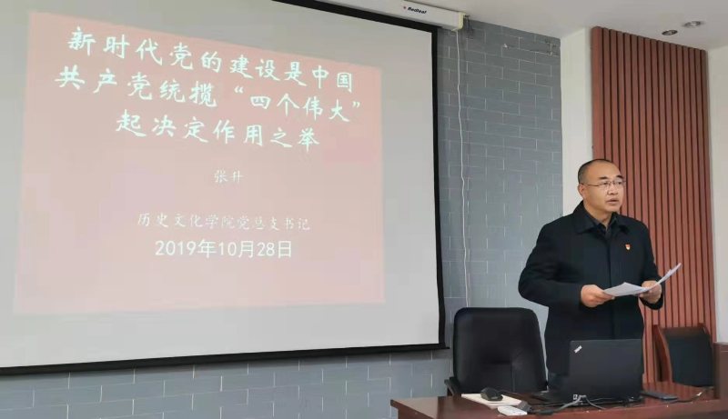 2019年10月28日,yl8858永利集团党总支书记张升,为学院师生党员讲题为“新时代党的建设是中国共产党统揽‘四个伟大’的关键之举”的党课,学校主题教育指导组恩和组长出席,全院师生党员参加。