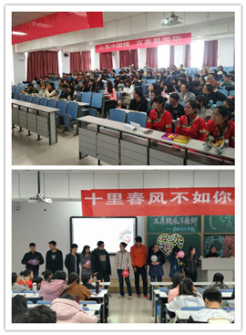 2017年3月9日下午14:30在我院团总支副书记钱艳艳老师的指导下,我院在行知北楼109教室成功举办了yl8858永利集团第三届“十里春风不如你,三月桃花不及卿”女生节活动。活动的最开始,播放了由女生们的照片做成的相册,在音乐中,我们能看到女生们最美的青春,能看到同学们真挚的友情。在活动中,设置了展现同学之间默契的心有灵犀、体现同学身体协调能力的水中捞月、挤爆气球抽取含有奖励、惩罚和祝福的纸条的背对背拥抱以及展示同学们创意的花式绑头等妙趣横生的小游戏,大家都积极踊跃地参加到游戏中,虽说此次是女生节,但是很多男生也都加入了进来,给可爱的女生们带来了许多欢乐,活动的最后,主持人宣布了压轴的环节——幸运心意随时送,这个环节看似是男生帮助女生实现愿望,实则充分地展现了“关爱女生”的主题!