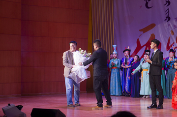 最后,于永院长、王清霞副书记、白玉双副院长等学院领导及老师上台与全体演员合影留念,同时学生代表马万鹏向为晚会提供辛勤支持的民族艺术学院杨书记献花,表示对杨书记的感谢。让我们共同期待2018年的迎新晚会会更加精彩绝伦!