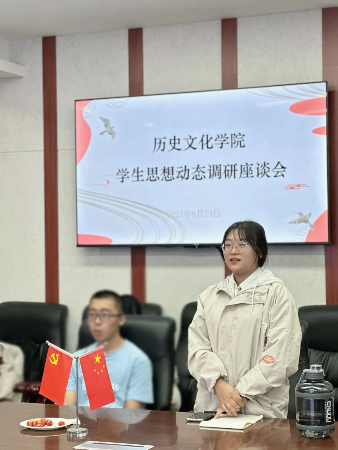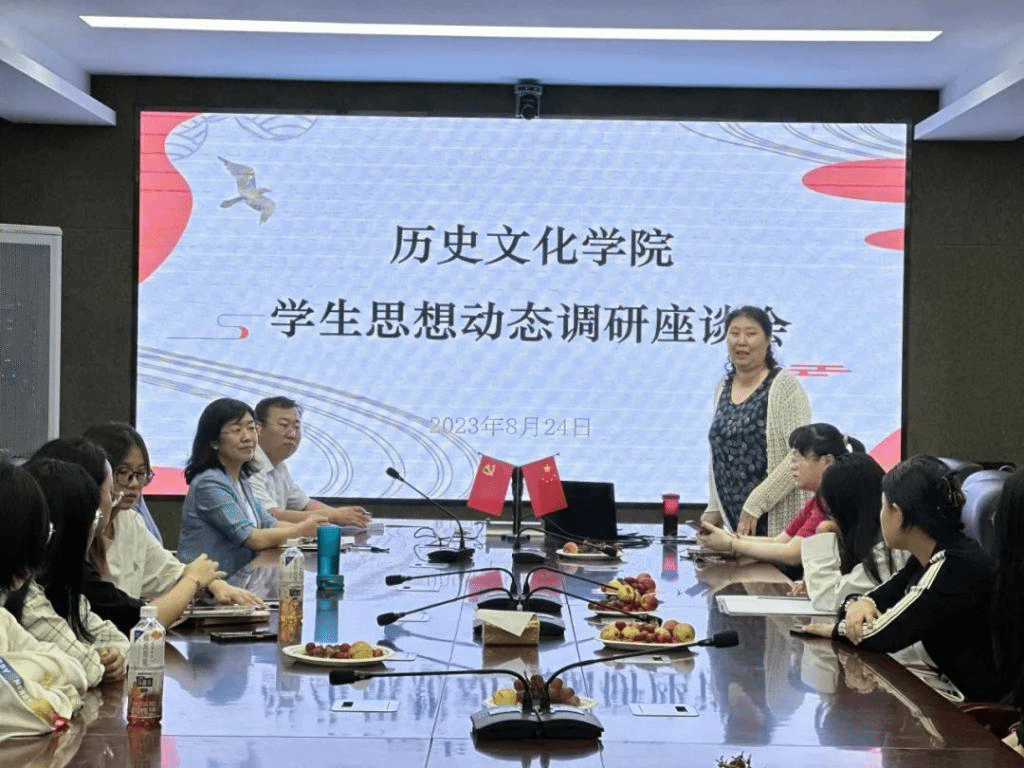 本次会议上,学生代表围绕学习贯彻习近平新时代中国特色社会主义思想、党的二十大精神、习近平总书记在内蒙古考察期间的重要指示批示精神的学思践悟情况进行交流发言,表示将结合历史专业实际,踔厉奋发、勇毅前行,争做有理想、敢担当、能吃苦、肯奋斗的新时代好青年。