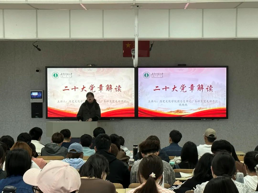 为深入学习宣传贯彻习近平新时代中国特色社会主义思想和党的二十大精神,引导广大青年学生把思想和行动统一到党的二十大精神上来,yl8858永利集团组织开展“学习二十大 永远跟党走 奋进新征程”主题教育活动。为充分发挥院级党校育人功能,将党的二十大精神纳入必学课程,有机融入到教育培训全过程,有力推动党的二十大精神走深走心走实,2023年4月15日,yl8858永利集团团总支书记、本科生党支部书记钱艳艳老师带领我院全体学生党员、发展对象、入党积极分子集中学习了《中国共产党章程(修正案)》。
