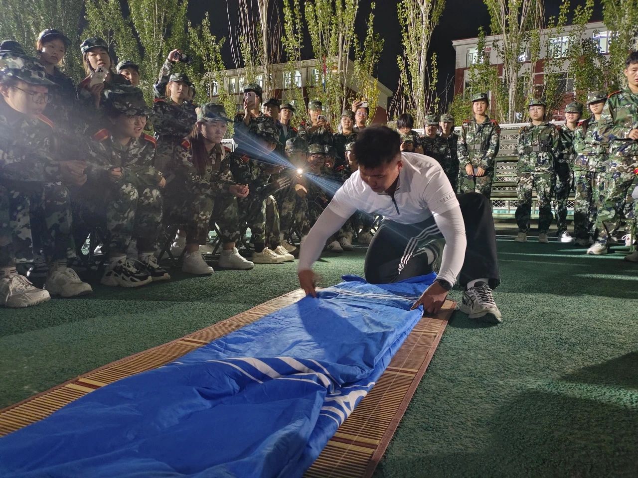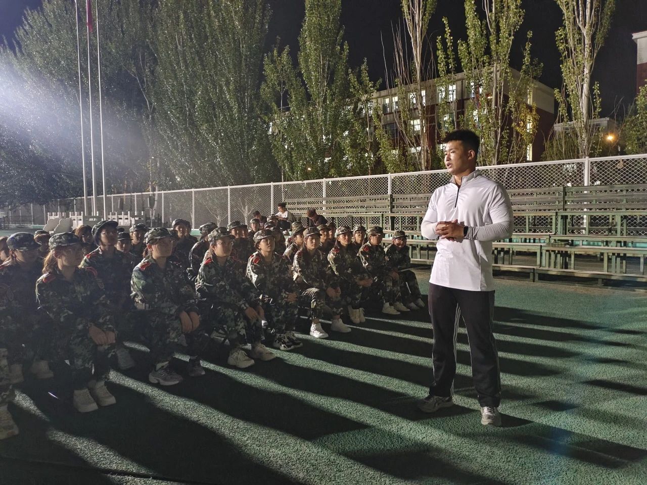 傍晚,王建国老师带领新生在东操场与军训教官进行见面沟通,学生干部张孟给新生作内务标准示范,为即将开始的军训生活做好准备。