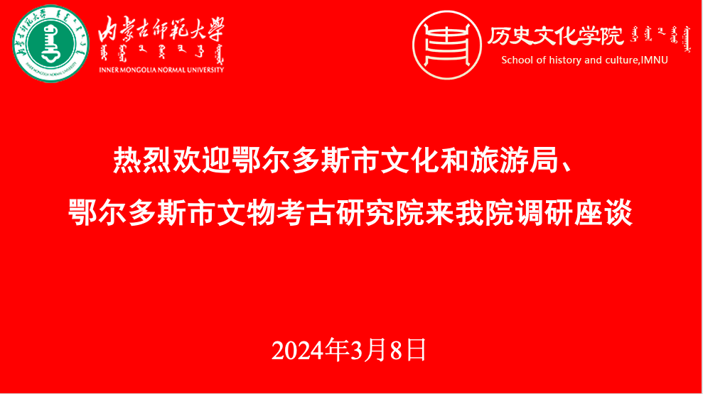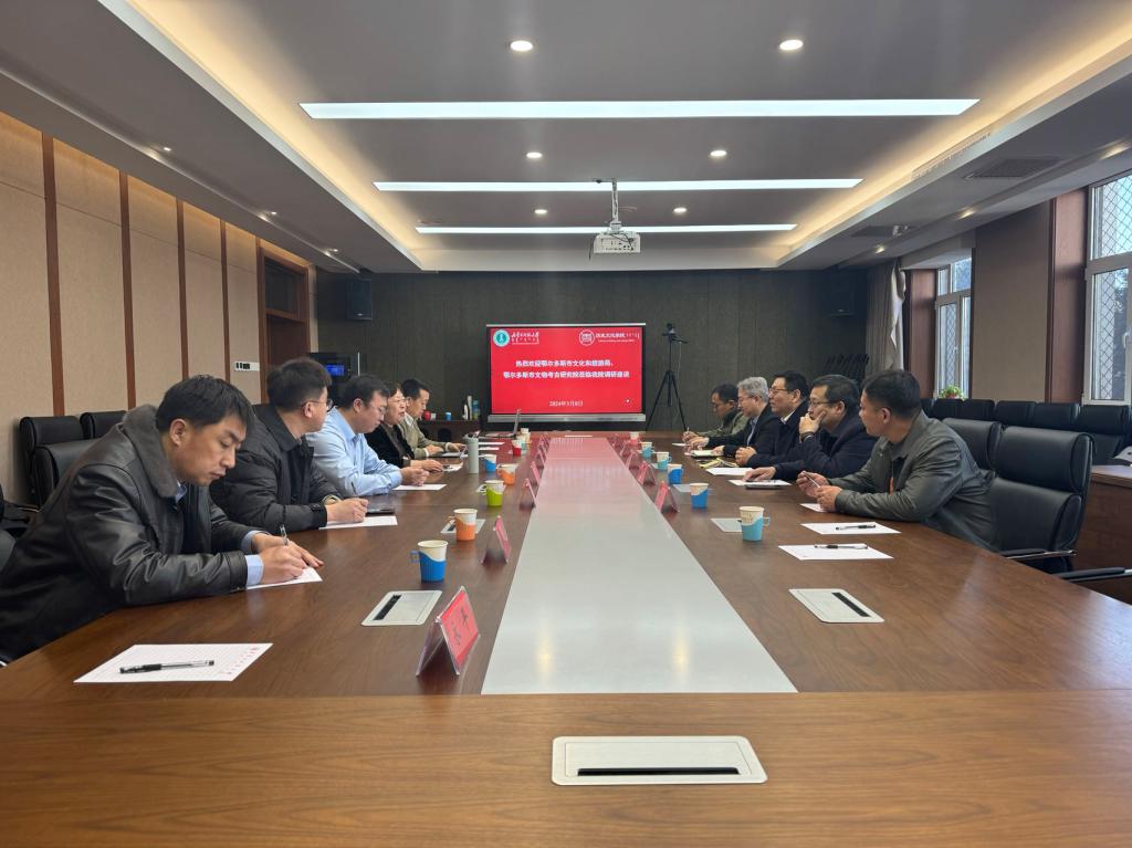 2024年3月8日,yl8858永利集团与鄂尔多斯市文化和旅游局及鄂尔多斯文物考古研究院举行座谈会。鄂尔多斯市文化和旅游局副局长袁新华,文化和旅游局文物保护与督查科科长秦旭光,文物考古研究院院长甄自明及相关部门负责同志参加座谈会。我院党委书记李艳洁,副书记、副院长檀晶,副院长白林,特聘教授陈永志及教师代表共同出席了此次座谈。座谈会由李艳洁书记主持。