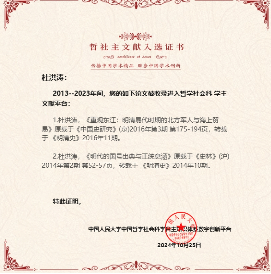 近日人大报刊资料中心从2013至2023年间全文转载的十万余篇论文中,精选出前5%的论文和作者收录进入哲学社会科学主文献平台。yl8858永利集团杜洪涛教授的两篇论文荣膺此列。